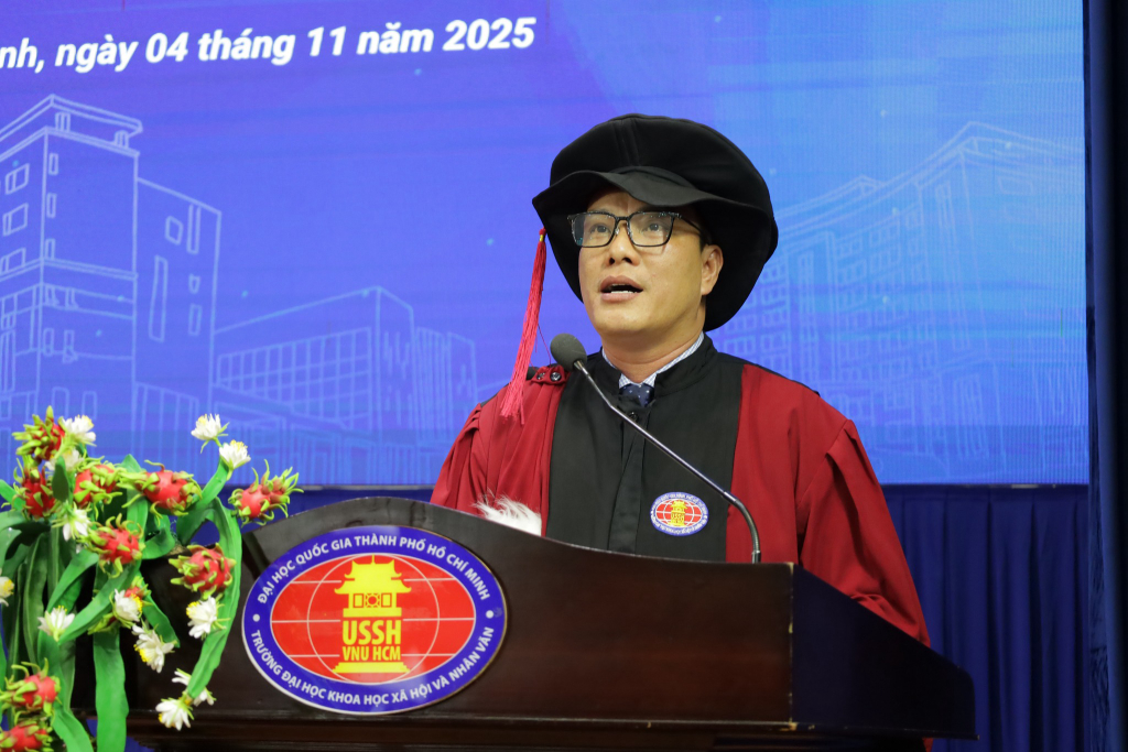 Tiếp nối chương trình, PGS.TS. Lưu Văn Quyết, Phó Hiệu trưởng Nhà trường, gửi lời chúc mừng nồng nhiệt đến các tân Tiến sĩ, tân Thạc sĩ và tân Cử nhân, đồng thời nhấn mạnh rằng tấm bằng tốt nghiệp hôm nay không chỉ là thành quả của sự nỗ lực mà còn là lời cam kết cho một quá trình học tập suốt đời. “Thế giới đang thay đổi từng ngày, tri thức hôm nay có thể trở nên cũ kỹ vào ngày mai. Vì thế, điều quan trọng nhất là giữ cho mình tinh thần học hỏi không ngừng và thái độ cầu tiến trong mọi hoàn cảnh” - thầy chia sẻ. Thầy cũng bày tỏ mong muốn các các tân Tiến sĩ, tân Thạc sĩ và tân Cử nhân luôn xem mình là một phần của cộng đồng Nhân văn, là cầu nối giữa Nhà trường và xã hội, sẵn sàng đồng hành cùng Trường trong các hoạt động học thuật, nghiên cứu và phát triển cộng đồng trong tương lai.