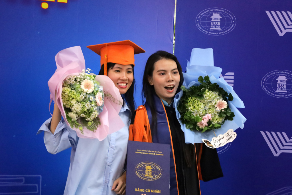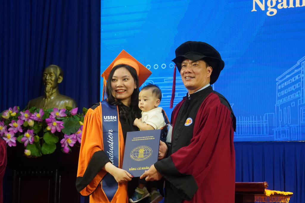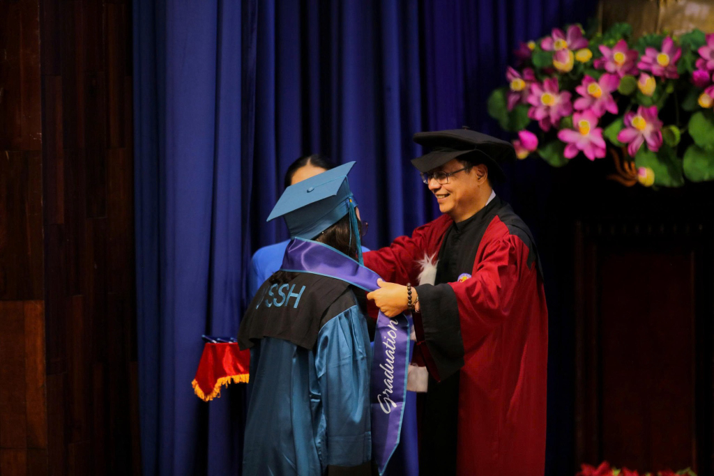 Trong không khí trang nghiêm của buổi lễ, các tân Tiến sĩ, Thạc sĩ và Cử nhân lần lượt đón nhận tấm bằng tốt nghiệp - minh chứng cho những nỗ lực không ngừng trong hành trình học tập và nghiên cứu tại Trường. Mỗi tấm bằng không chỉ đánh dấu một cột mốc quan trọng trong sự nghiệp học thuật, mà còn là lời khẳng định cho tinh thần bền bỉ, ý chí vượt khó của người học Nhân văn. Khoảnh khắc ấy khép lại một chặng đường phấn đấu đầy tự hào và mở ra những cơ hội mới để các tân khoa tiếp tục phát huy tri thức, phụng sự cộng đồng và khẳng định bản thân trên con đường phía trước.