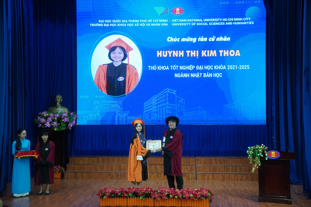Tại buổi lễ, Huỳnh Thị Kim Hoa, thủ khoa ngành Nhật Bản học đã bày tỏ lòng biết ơn sâu sắc đến Nhà trường, quý thầy cô, gia đình và bạn bè đã đồng hành trong suốt quá trình học tập và nghiên cứu. Cô chia sẻ rằng hành trình tại Trường Nhân văn không chỉ giúp sinh viên trưởng thành về tri thức, mà còn về nhân cách và tư duy sống. “Thành công không chỉ đến từ tài năng, mà còn từ lòng kiên trì, sự tử tế và tinh thần nhân văn, những giá trị mà Trường đã trao cho chúng em” - cô chia sẻ.