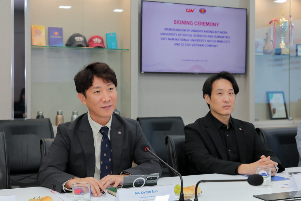 Đại diện đối tác, ông Ko Jae Soo, Tổng Giám đốc CJ CGV Việt Nam, cho biết doanh nghiệp không chỉ vận hành hệ thống rạp chiếu phim mà còn là nhà phân phối phim lớn nhất, đồng thời tham gia đầu tư và sản xuất nhiều dự án điện ảnh. Đây là nền tảng để mở ra những hướng hợp tác phong phú với Nhà trường. Ông nhận định, trong bối cảnh ngành công nghiệp điện ảnh và văn hóa Việt Nam đang tăng trưởng mạnh mẽ, hai bên có nhiều cơ hội cùng tạo dựng sân chơi và phát triển tiềm năng cho thế hệ trẻ. CJ CGV Việt Nam sẵn sàng đồng hành tổ chức các hoạt động sáng tạo, quảng bá tác phẩm của sinh viên, khai thác các dự án chuyển thể văn học – điện ảnh nghệ thuật, và tiếp tục ươm mầm những tài năng điện ảnh trẻ.